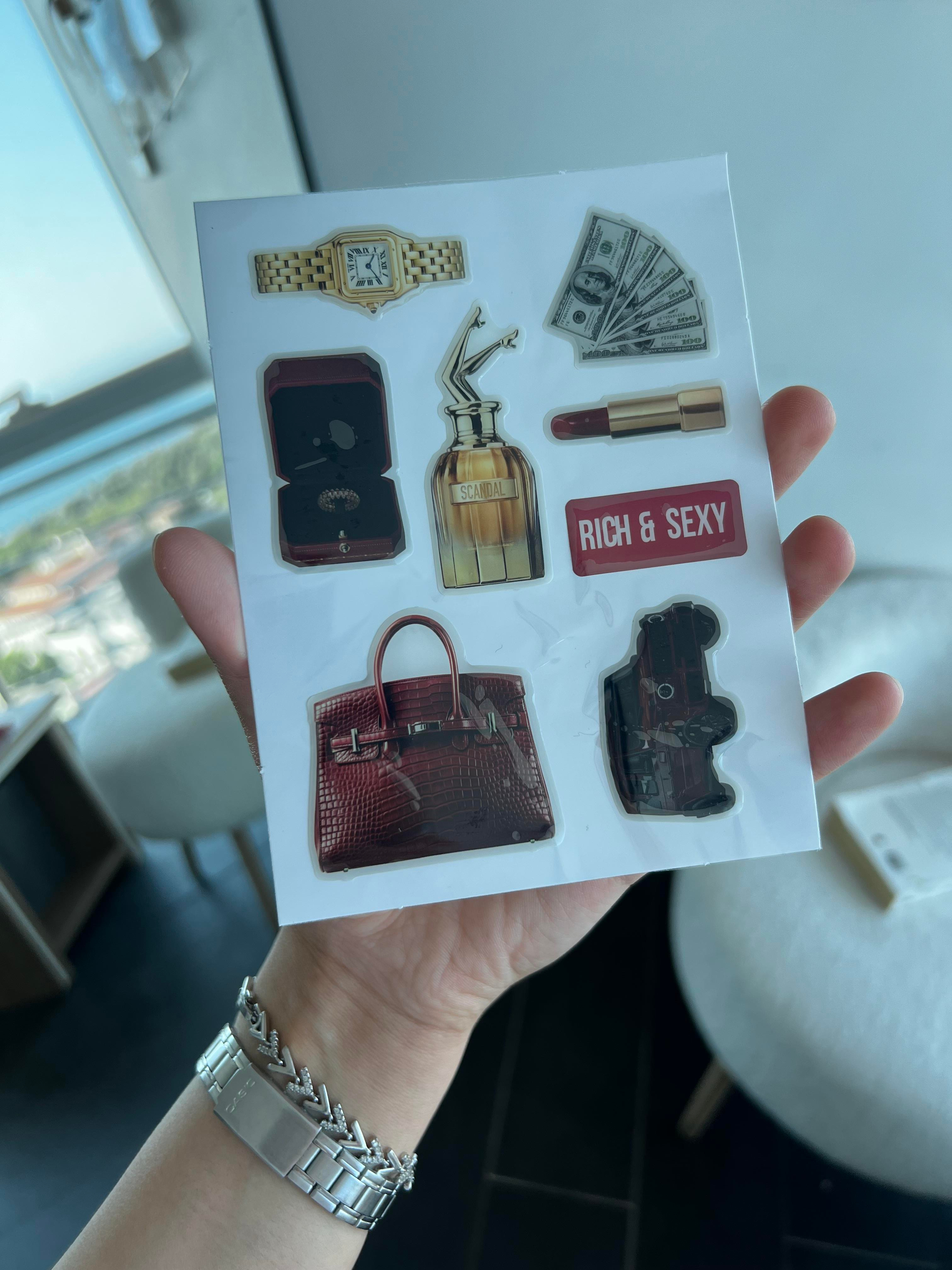 Tarzını yansıt, eşyalarını kişiselleştir! Yüksek kaliteli vinil malzemeden üretilen sticker setlerimiz; suya ve çizilmeye dayanıklı yapısıyla uzun süre ilk günkü parlaklığını korur. Lüksü ve ihtişamı sevenler için Zengin & Çekici Sticker Seti tam senlik! Altın saat, parfüm, kırmızı çanta ve para figürleriyle eşyalarını bir adım öne çıkar. Şıklığını sticker’larınla tamamla. Laptop, telefon kılıfı, defter, valiz veya ayna gibi düz yüzeylere kolayca yapıştırabilirsin.